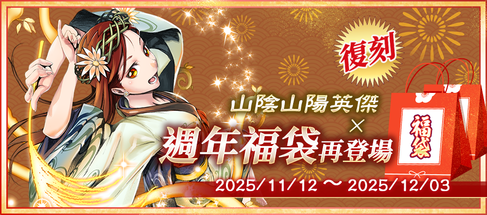 2025 年 11 月 12 日(三)維護後 ~ 2025 年 12 月 10 日(三)維護前,使用《山陰山陽御緣鈴》除獲得「英傑」之外,還能進一步的獲得「御緣點數」,累積御緣點數,可換取該「御緣鈴」對應的主打英傑、鬼神石和功績帳等相關道具。