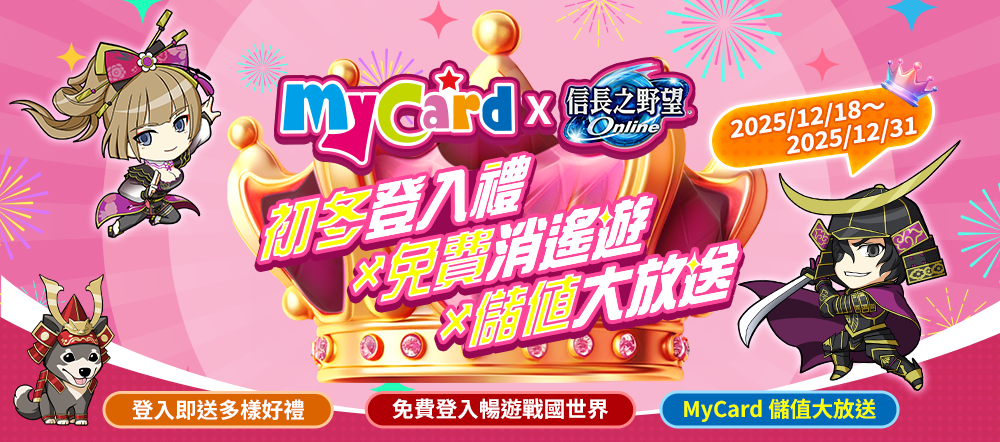 活動期間單筆購買 MyCard 指定面額點數且儲值至「信長之野望 Online」遊戲帳號,將依面額送「開運抽選券・卯」!