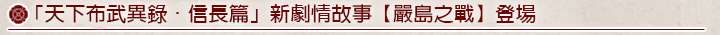 朝天下統一之路邁進,進入中國.四國地區的織田軍,在月山富田城擊破毛利.長宗我部.雜賀聯軍。即便如此,敗北的聯軍氣勢依然不見消退,毛利與常宗我部強化連攜,發揮水軍優勢,在嚴島佈陣,擺明抗戰到底的意志。究竟,織田信長能否成功在"嚴島之戰"中獲勝呢?