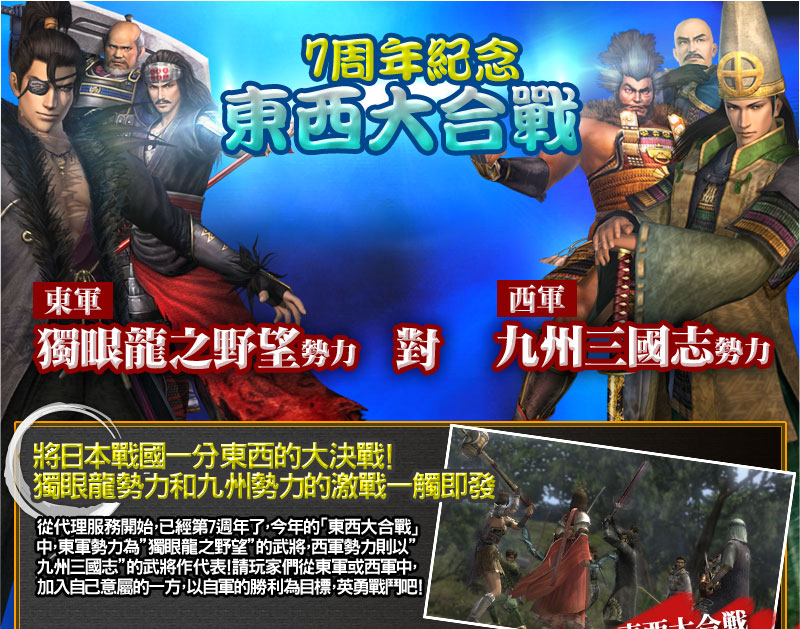 東西大合戰中,全玩家人物之能力皆統一,亦將給予裝備品與道具,任何人都能無負擔的參與,盡情享受本次的東西大合戰