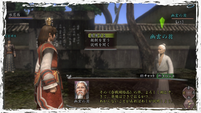 與各城NPC”保管處”附近NPC”幽玄之翁”說話後可聽取東西大合戰說明與獲得參陣報名報酬