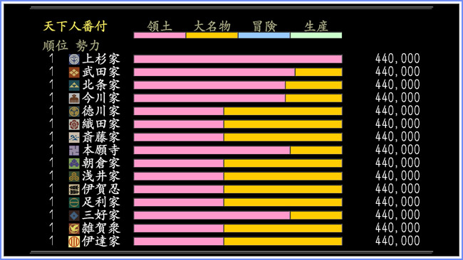 初期狀態下的各勢力領土得分沒有改變,但領土差異點數部分的大名物,改由各勢力持有,如此一來,使天下人總分均相同。