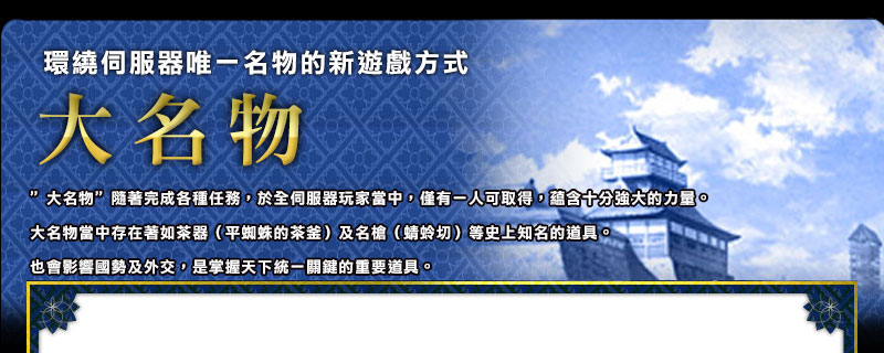執行當週選定的大名物任務,將傳聞變更為確信的任務。任務每日變更,準備各種推薦等級及達成條件的調查任務。達成後,將提升針對勢力內關於大名物的信憑度,朝獲得大名物更邁進一大步。