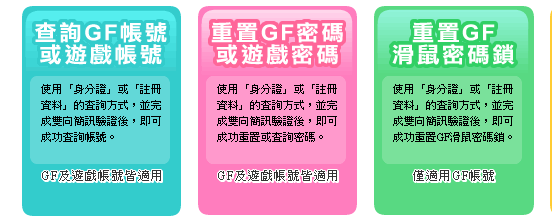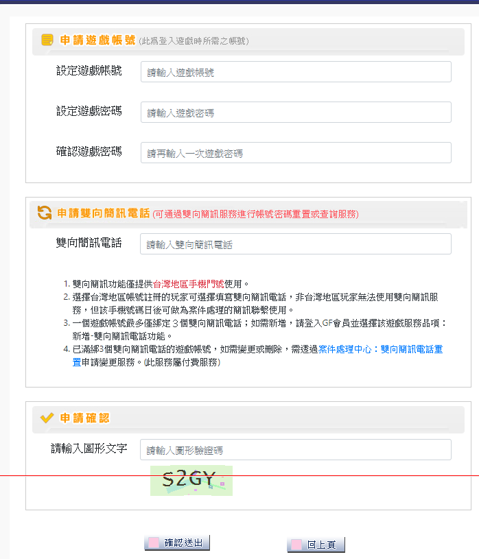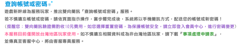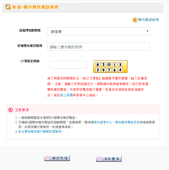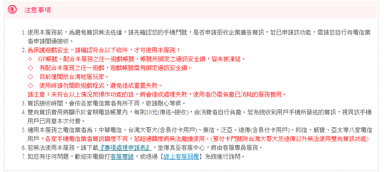 於遊戲帳戶登記雙向簡訊門號,加強遊戲帳號管理!登記後如果之後有帳號或者密碼的查詢需求,就可利用雙向簡訊系統自動查詢!方便又快速。僅限台灣手機門號使用!